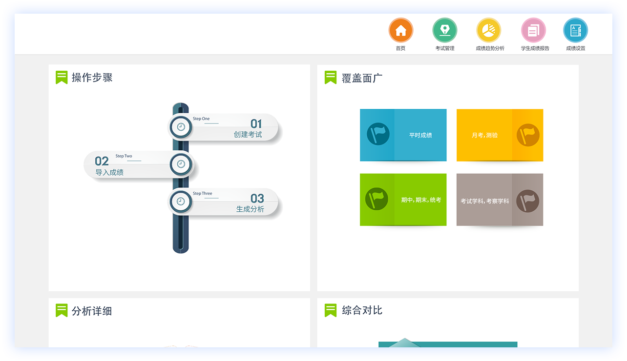 支持單科(kē)成績分(fēn)析,總分(fēn)分(fēn)析,班級分(fēn)析,年(nián)級分(fēn)析,學生(shēng)個(gè)人(rén)分('fēn)析。